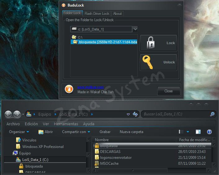 - Para bloquear, busca la carpeta que deseas bloquear y la abrimos (esto es importante, pulsamos doble click en el cuandro donde seleccionemos la carpeta, si no la abrimos no la bloquerá (por lo que comprobé)), pulsa "Lock" e especifica una constraseña, después cierra Budulock en "Close" (si no cierras el programa los efectos no surgirán). Cuando la carpeta este bloqueada se cambiará el icono por un candado.