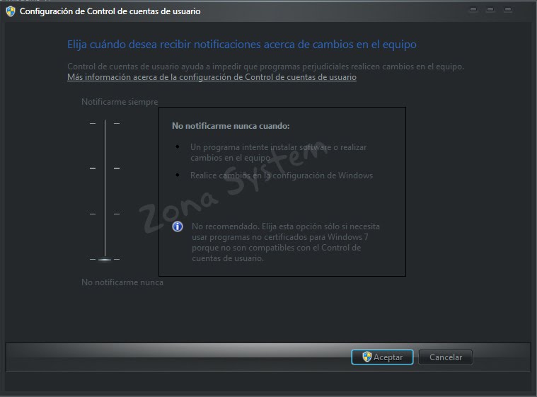 - Vamos a: Inicio -> Panel de Control -> Cuentas de Usuario -> Cambiar configuración de Control de cuentas de usuario -> Mover la barra hacia abajo de todo, donde dice "No notificarme nunca"