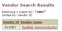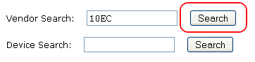 Ahora escribimos "10EC" en el campo Vendor Search y pulsamos en el botón "Search" para obtener la información del fabricante.