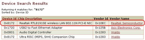 En el ejemplo, el dispositivo desconocido se trataba de una tarjeta "Realtek RTL9191SE wireless LAN 802.11N". (Id. de dispositivo = 8172 e Id. de fabricante = 10EC)