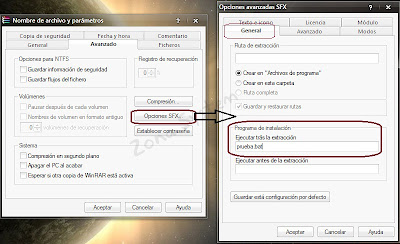 [3] - Ahora, en la pestaña "Avanzado -> pulsamos en: Opciones SFX". Y se nos mostrará una ventana con distintas pestañas. En la pestaña "General -> Programa de instalación" si ponemos el nombre del fichero con su extensión original en "Ejecutar trás la extracción", se nos ejecutará automaticamente el archivo .bat después de descomprimirlo.